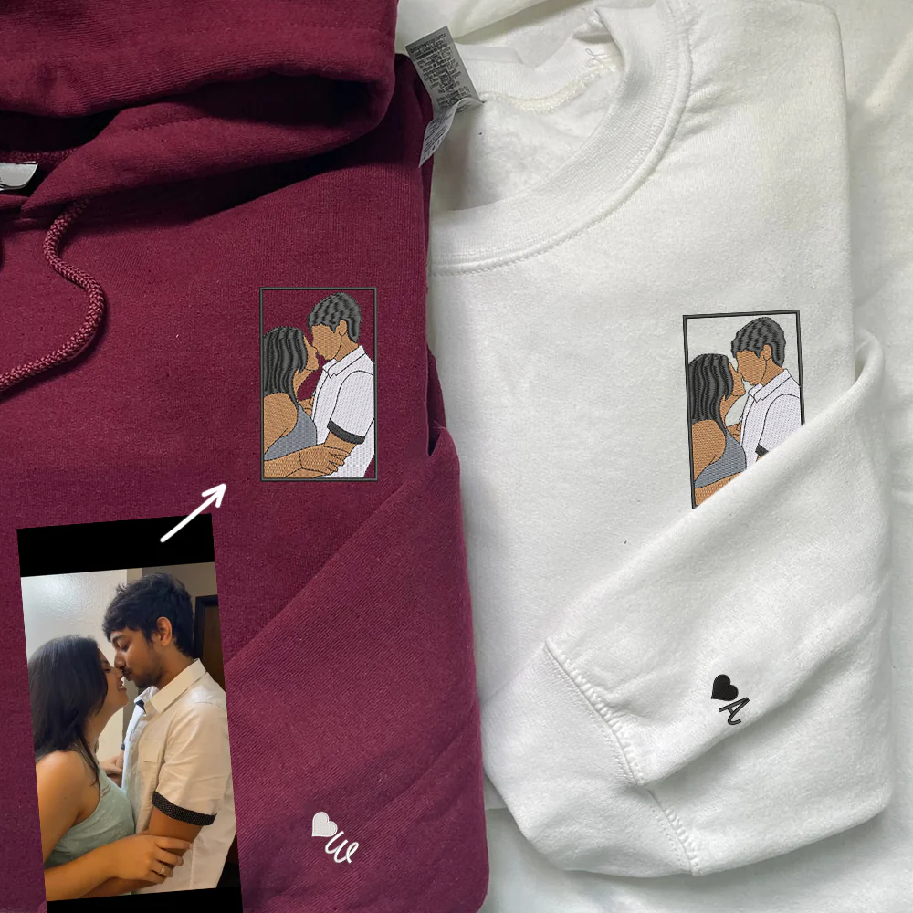 Custom Embroidered Couple Portrait Full-color Sweatshirt Hoodie, Personalized Couple Photo Sweatshirts Hoodies