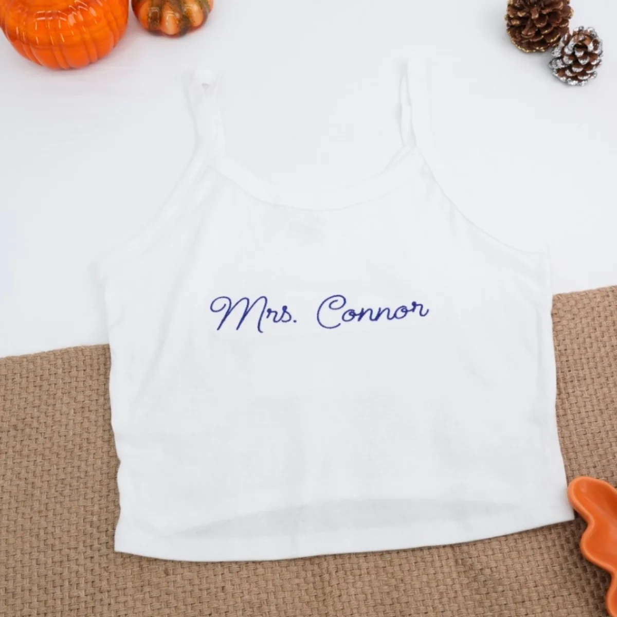 Custom last name tank top featuring beautiful personalized embroidery in elegant white script on premium black cotton. Perfect for showcasing family pride, newlywed status, or personal style! Ideal for family reunions, weddings, honeymoon, vacation, or everyday wear. Makes great gift for birthdays, anniversaries, bridal parties, or family celebrations. Comfortable relaxed fit perfect for layering or wearing alone. High-quality embroidery that stays crisp and vibrant. Available in multiple sizes