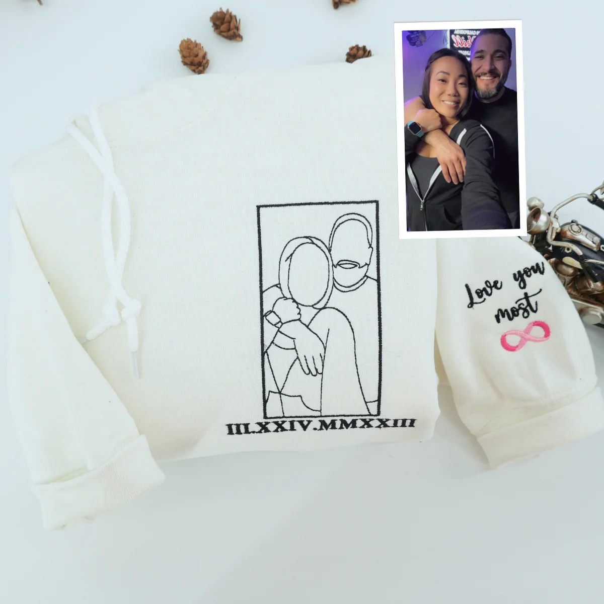Celebrate your love story with this custom line art embroidered sweatshirt, featuring your wedding photo turned into minimalist threadwork. Personalized with your wedding date and initials, it's a meaningful keepsake for newlyweds or an anniversary gift. The clean, single-color design creates a timeless look that's both elegant and cozy — perfect for reliving the best day of your life, one stitch at a time.