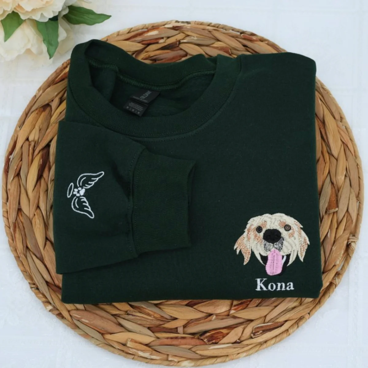 Celebrate your beloved pup with custom pet portrait sweatshirts featuring detailed facial embroidery paired with elegant script name lettering. Our expert artisans transform your dog's photo into stunning embroidered artwork that captures their unique personality, coloring, and expressions. Available in beautiful light blue, burgundy, and other premium colors to complement any style. Perfect for dog moms, pet parents, and anyone who wants to carry their furry family member close to their heart. Premium quality crewneck sweatshirts that showcase the special bond between pet and parent with artistic flair.